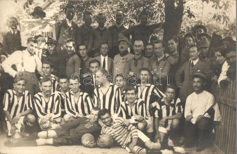 1924 Dicsőszentmárton, Tarnaveni, Diciosanmartin; 82. gyalogezred a Dacia focicsapat ellen, hátoldalon a sportolók nevei és az eredmény / Reg. 82. vs. Dacia football match, group picture with the teams, football players' names and final score on the backside. Olga Fischer photo
