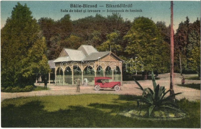 Bikszád-fürdő, Baile Bixad; Sala de baut si izvoare / Ivócsarnok és források, automobil. Jónás Ármin Nr. 5. 1929. / drinking hall, mineral springs, automobile