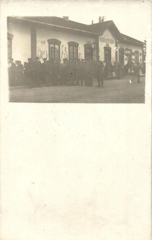 Beschreibung: Gátalja, Gáttája, Gataia; vasútállomás katonákkal / railway station with soldiers, photo