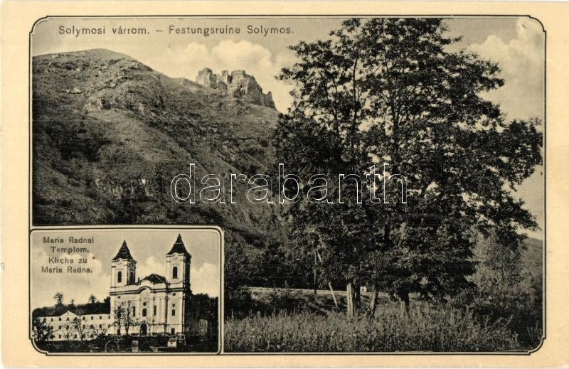 Beschreibung: Máriaradna, Radna; Solymosi várrom, Máriaradnai kegytemplom. Rauch Sándor kiadása, Sternád Albert fényképész felvétele / Soimos castle ruins, pilgrimage church