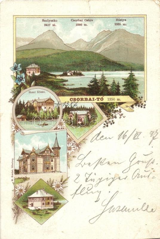 1897 (Vorläufer!) Tátra, Tatry; Csorbai tó, Szoliszkó, Bástya, Hotel Klimo, villa. M. Kuschel / Strbské Pleso, Solisko, Basta, hotel, villa. Art Nouveau, floral, litho (vágott / cut)