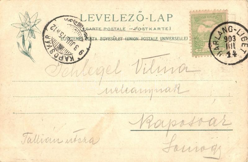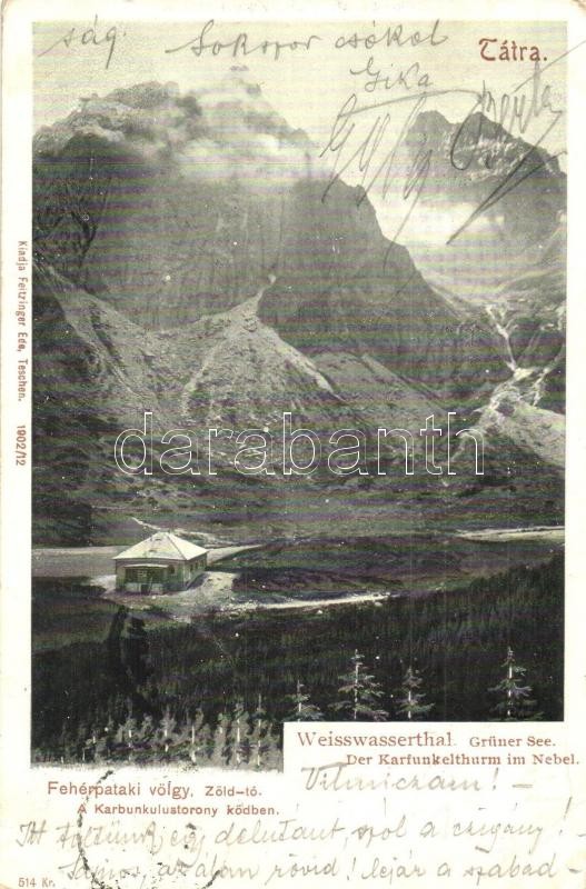 1903 Tátra, Tatry; Fehérpataki völgy, Zöld tó a Frigyes főherceg menházzal, Karbunkulustorony a ködben. Feitzinger Ede 514. 1902/12. / Der Grüner See mit d. Erzh. Friedr. Schutzhaus, Der Karfunkelthurm im Nebel / Dolina Bieleho Potoka, Zelené pleso, Jastrabia veza, Chata pri Zelenom plese / valley, lake, rest house, shelter hut, mountain peak in the mist (EK)