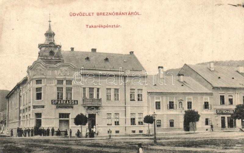 Breznóbánya, Brezno nad Hronom; Takarékpénztár, Deutsch Adolf áruházai. Kreisler József kiadása / savings bank, shops (megerősített sarkak / restored cornmers)