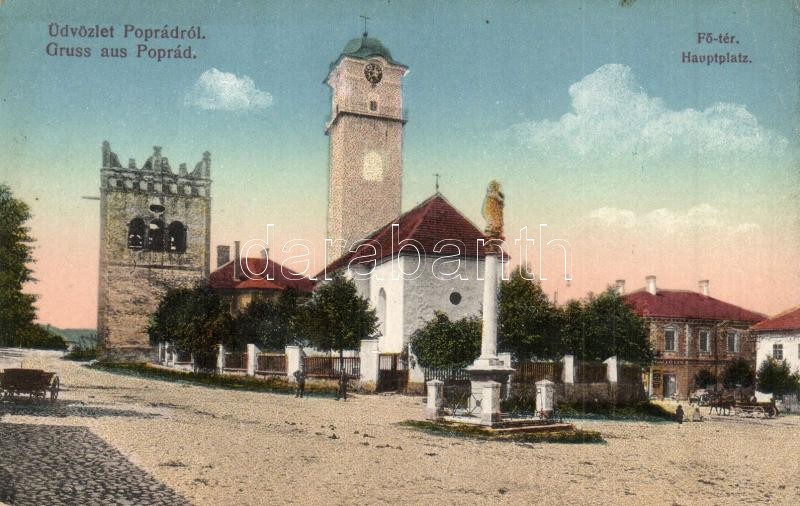 Poprád (Tátra), Fő tér, templom, Csonka-torony, szobor / main square, ... https://www.darabanth.com/de/328-Fernauktion/328.0/Ansichtskarten/Slowakei~2000007/Poprad-Tatra-Fo-ter-templom-Csonka-torony-szobor-main-square-church-tower-statue-EK~II1826859