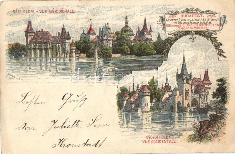 Beschreibung: 1898 Budapest XIV. Ezredéves országos kiállítás történelmi főcsoportjának épületei, Déli és nyugati oldal, barna 2 Kr Ga. s: Morelli, Dörre T. (EK)