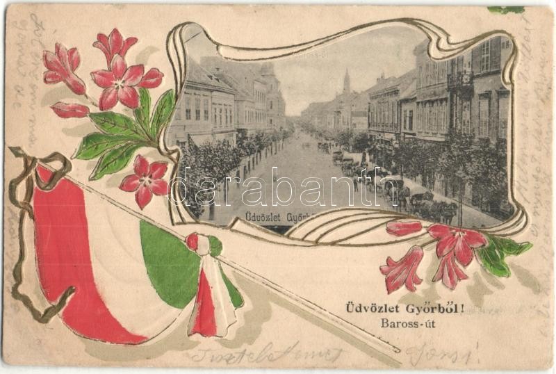Beschreibung: 1907 Győr, Baross út, lovaskocsik. Magyar zászló Emb. litho Art Nouveau keret (r)