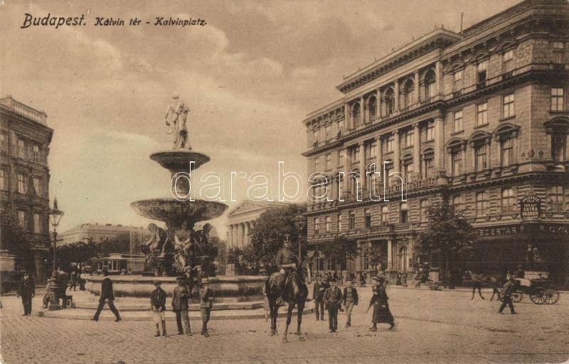 Beschreibung: Budapest VIII. Kerepesi út, szökőkút, Pesti hazai Első takarékpénztár egyesület, gyógyszertár, villamos
