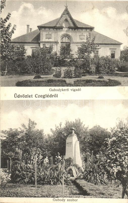 Beschreibung: Cegléd, Gubody kerti vigadó, étterem, Gubody Ferenc szobor. Sebők Béla kiadása (EK)