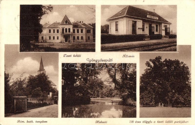 Beschreibung: Gyöngyösapáti, Tiszti üdülő (Széchenyi kastély), vasútállomás, római katolikus templom, halastó, 700 éves tölgyfa, Balaton László kiadása (EB)