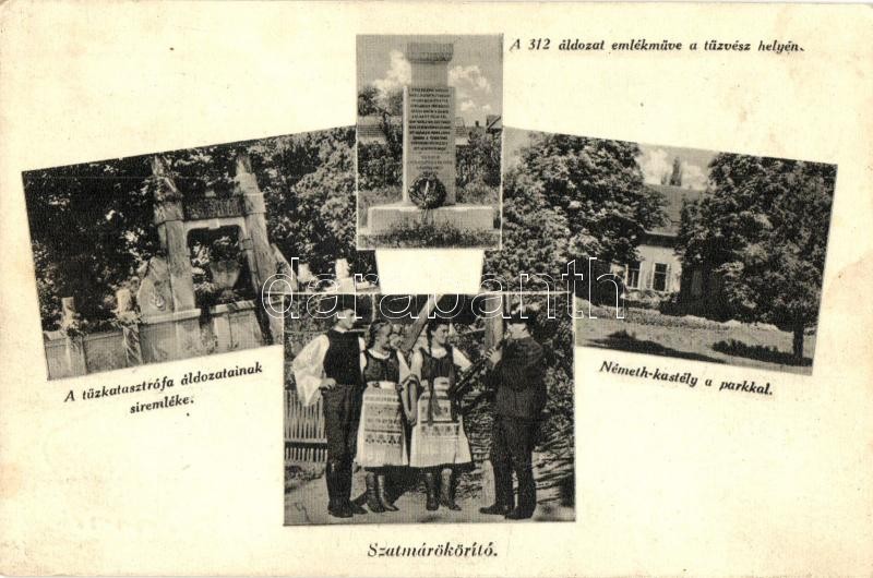 Beschreibung: Ököritófülpös, Szatmárököritó; Németh kastély, népviselet, 312 áldozat emlékműve a tűzvész helyén, Tűzkatasztrófa áldozatainak síremléke