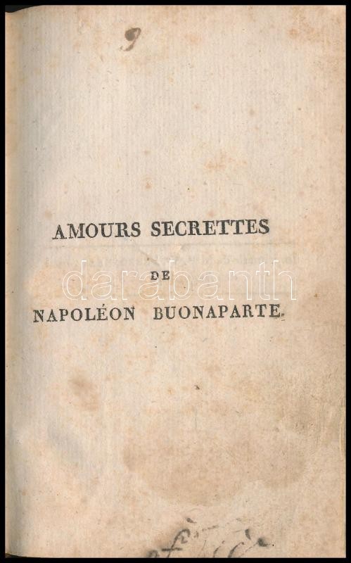 Amours Secrettes de Napoléon Buonaparte. Tome Premier. Paris, 1815, Germain Mathiot, 1 t. (címkép)+XXII+264 p. Második kiadás. Francia nyelven. Korabeli kopottas aranyozott gerincű félbőr-kötés. Kb 10 helyen egy-egy szó kikaparva a szövegből, néhol lyukadást okozva. / With some words scratched out from the text.