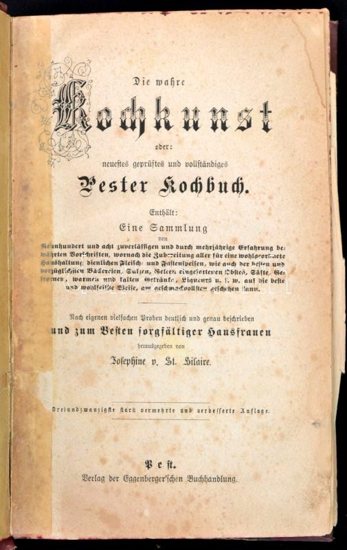 St. Hilaire, Josephine: Die wahre Kochkunst oder neuestes geprüftes und vollständiges Pester Kochbuch. Pest, 1869, Eggenberger. Későbbi, kicsit kopott félvászon kötésben, helyenként javított.