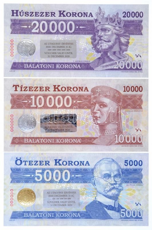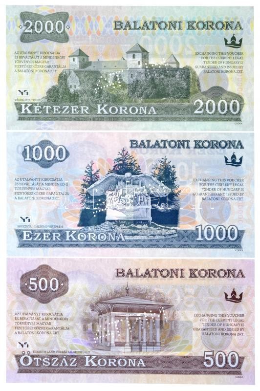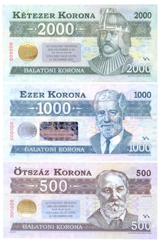 2012. 500K "Balatoni Korona" helyi pénz, "000000" sorszámmal + 2012. 1000K "Balatoni Korona" helyi pénz, "000000" sorszámmal + 2012. 2000K "Balatoni Korona" helyi pénz, "000000" sorszámmal + 2012. 5000K "Balatoni Korona" helyi pénz, "000000" sorszámmal + 2012. 10.000K "Balatoni Korona" helyi pénz, "000000" sorszámmal + 2012. 20.000K "Balatoni Korona", helyi pénz "000000" sorszámmal, mindegyik "MINTA" perforációval és hologramos kétnyelvű "AZ UTALVÁNY ÉRVÉNYES 2020. DECEMBER 31-IG" matricával T:I