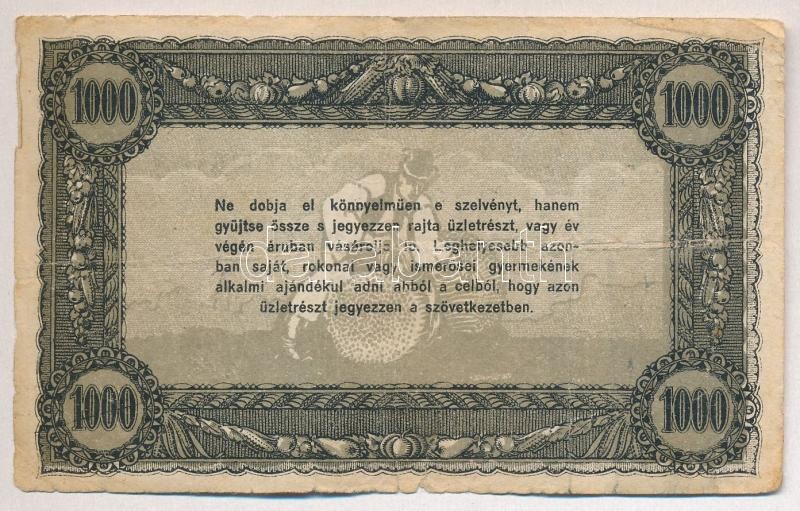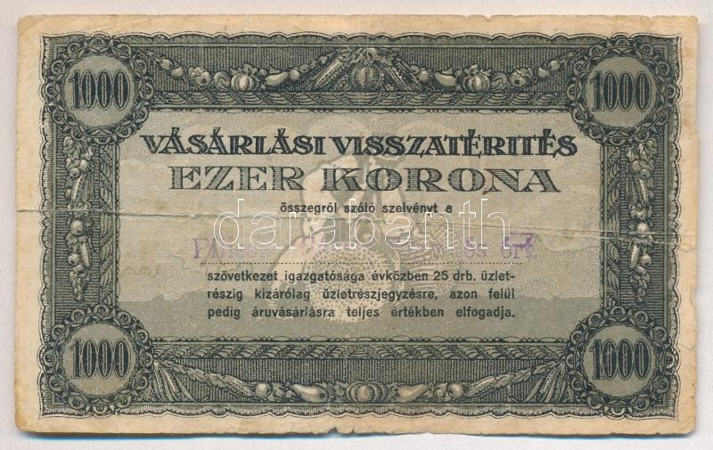 Beschreibung: ~1920. 100K "Vásárlási visszatérítés" 1000K-ról "PILISSZENTLÁSZLÓ FOGY. ÉS ÉRT." bélyegzéssel T:III-