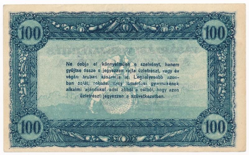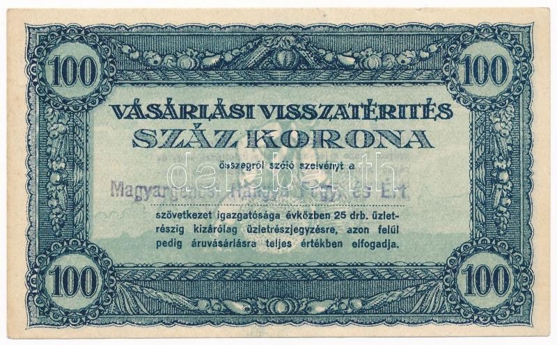 Beschreibung: ~1920. 100K "Vásárlási visszatérítés" rajta "Magyargencsi Hangya Fogy. és Ért." bélyegzéssel T:II