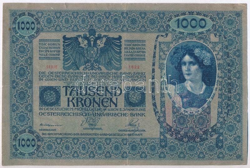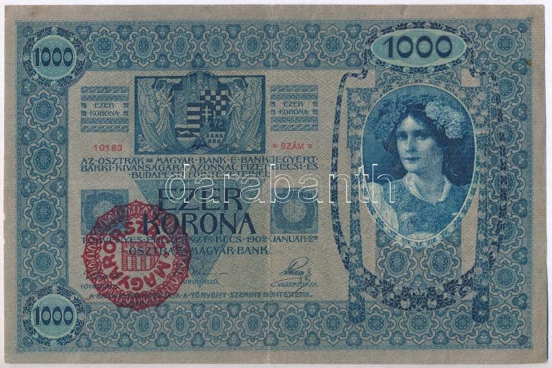 1902. 1000K piros "MAGYARORSZÁG" körbélyegzővel T:III kis sz... https://www.darabanth.com/de/328-Fernauktion/328.0/Numismatik/Ungarische-Banknoten~2500006/1902-1000K-piros-MAGYARORSZAG-korbelyegzovel-TIII-kis-szakadasok~II1825999