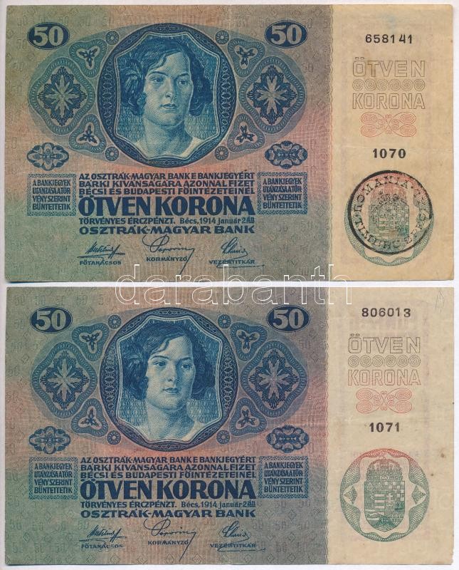 1914. 50K (2x) egyik "ROMANIA TIMBRU SPECIAL" felülbélyegzés... https://www.darabanth.com/de/328-Fernauktion/328.0/Numismatik/Ungarische-Banknoten~2500006/1914-50K-2x-egyik-ROMANIA-TIMBRU-SPECIAL-felulbelyegzessel-TIII~II1825992