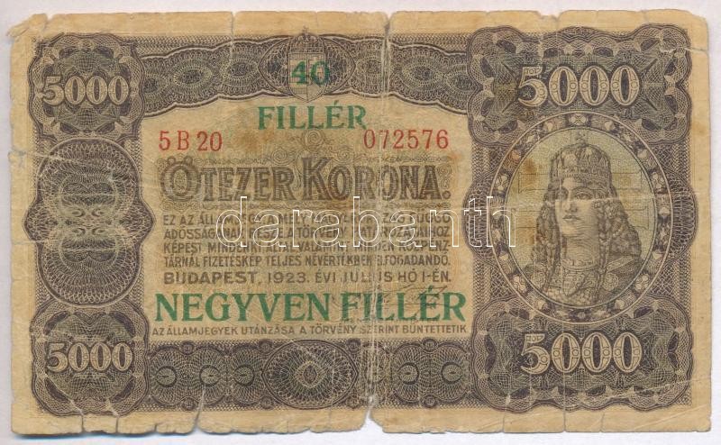 1923. 5000K T.W. jelöléssel, nyomdahely jelölés nélkül "40 FILLÉR... https://www.darabanth.com/de/328-Fernauktion/328.0/Numismatik/Ungarische-Banknoten~2500006/1923-5000K-TW-jelolessel-nyomdahely-jeloles-nelkul-40-FILLER-NEGYVEN-FILLER-felulbel~II1825928