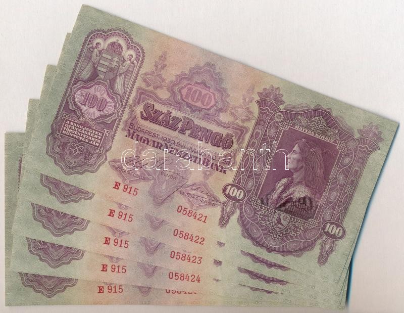 1930. 100P (5x) sorszámkövetők T:I https://www.darabanth.com/de/328-Fernauktion/328.0/Numismatik/Ungarische-Banknoten~2500006/1930-100P-5x-sorszamkovetok-TI~II1827496