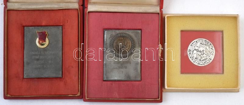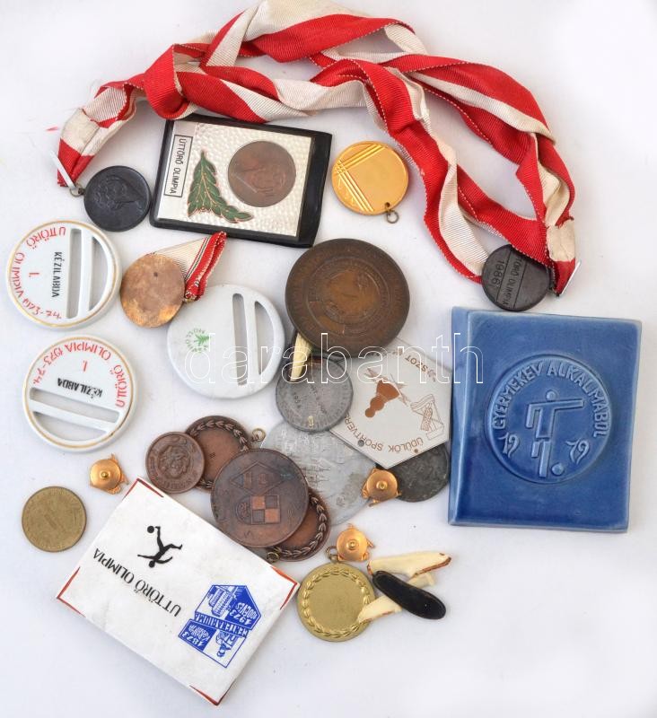 Kis doboznyi vegyes sportérem és díjplakett tétel, nagyrészt úttörő olimpia, közte 1955. "100. Ausztria-Magyarország Labdarúgó Mérkőzés" Al emlékérem (61,5mm) T:vegyes