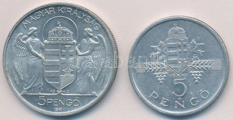1943. 5P Al "Horthy Miklós születésének 75. évfordulója" + 1... https://www.darabanth.com/de/328-Fernauktion/328.0/Numismatik/Ungarische-Munzen-und-Munzen-mit-ungarischem-Munzzeichen~2500007/1943-5P-Al-Horthy-Miklos-szuletesenek-75-evforduloja-plus-1945-5P-Al-Parlament-T1-2~II1827796
