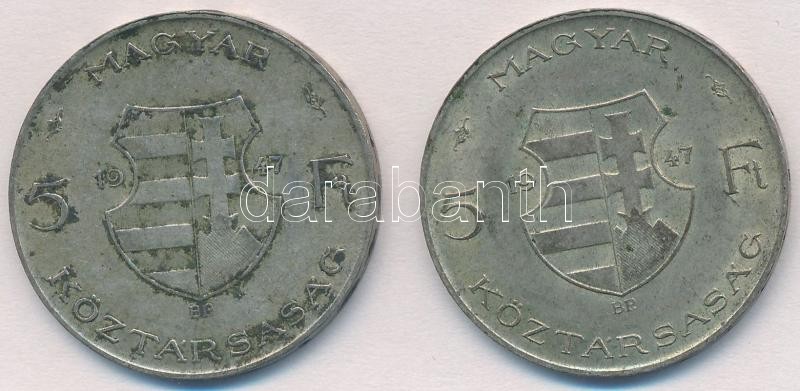 1947. 5Ft Ag "Kossuth" (2x) T:2,2- patina https://www.darabanth.com/de/328-Fernauktion/328.0/Numismatik/Ungarische-Munzen-und-Munzen-mit-ungarischem-Munzzeichen~2500007/1947-5Ft-Ag-Kossuth-2x-T2-2-patina~II1825838
