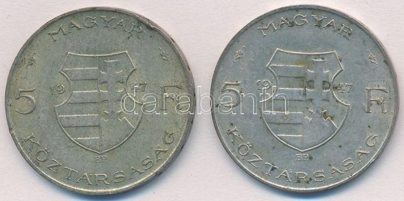1947. 5Ft Ag "Kossuth" (2x) T:2,2- patina https://www.darabanth.com/de/328-Fernauktion/328.0/Numismatik/Ungarische-Munzen-und-Munzen-mit-ungarischem-Munzzeichen~2500007/1947-5Ft-Ag-Kossuth-2x-T2-2-patina~II1825841