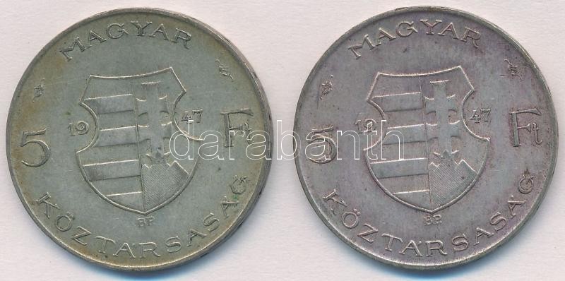 1947. 5Ft Ag "Kossuth" (2x) T:2,2- patina https://www.darabanth.com/de/328-Fernauktion/328.0/Numismatik/Ungarische-Munzen-und-Munzen-mit-ungarischem-Munzzeichen~2500007/1947-5Ft-Ag-Kossuth-2x-T2-2-patina~II1825845