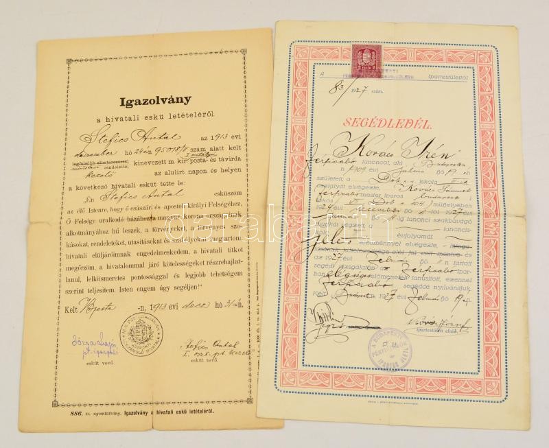1913-1927 2 db irat: eskü- ill. segédlevél https://www.darabanth.com/de/329-Fernauktion/329.0/Andere-Sammelgebiete/Dokument~500016/1913-1927-2-db-irat-esku-ill-segedlevel~II1836477