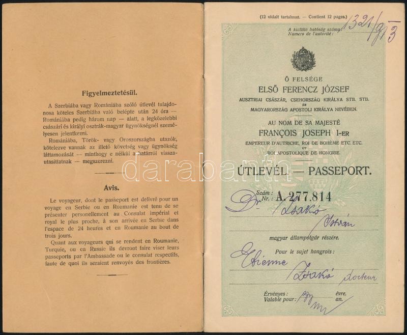 1913 Dicsőszentmárton, Őfelsége Ferenc József császár nevében kiállíto... https://www.darabanth.com/de/329-Fernauktion/329.0/Andere-Sammelgebiete/Dokument~500016/1913-Dicsoszentmarton-Ofelsege-Ferenc-Jozsef-csaszar-neveben-kiallitott-utlevel-magyar~II1837303