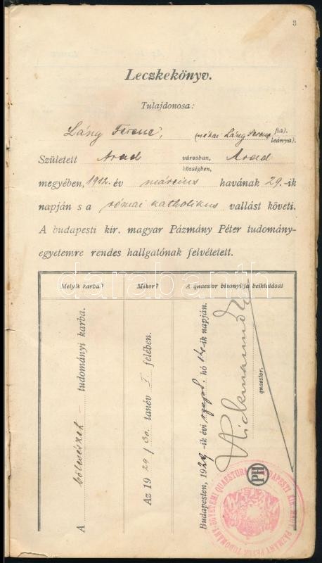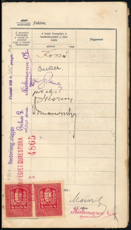 Beschreibung: 1929 Bölcsész leckekönyv Pauler Ákos, Domanovszky Sándor és más tanárok aláírásaival