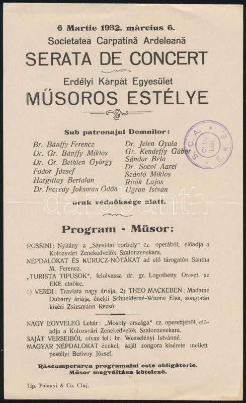 1932 Az Erdélyi Kárpát Egyesület műsoros estélyének programja https://www.darabanth.com/de/329-Fernauktion/329.0/Andere-Sammelgebiete/Dokument~500016/1932-Az-Erdelyi-Karpat-Egyesulet-musoros-estelyenek-programja~II1836842