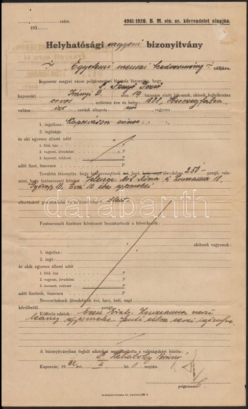 1932 Helyhatósági vagyoni bizonyítvány Kaposvár okmánybélyeg https://www.darabanth.com/de/329-Fernauktion/329.0/Andere-Sammelgebiete/Dokument~500016/1932-Helyhatosagi-vagyoni-bizonyitvany-Kaposvar-okmanybelyeg~II1612447