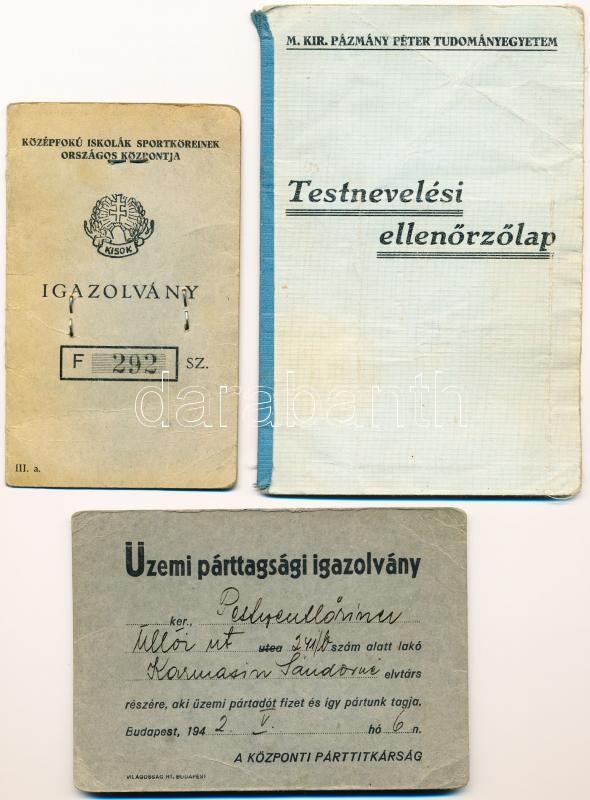 Beschreibung: 1933 Érdekes igazolványok: Testnevelési ellenőrzőlap egyetemi hallgató részére. Fényképes. + KISOK igazolvány + Üzemi párttagsági igazolvány