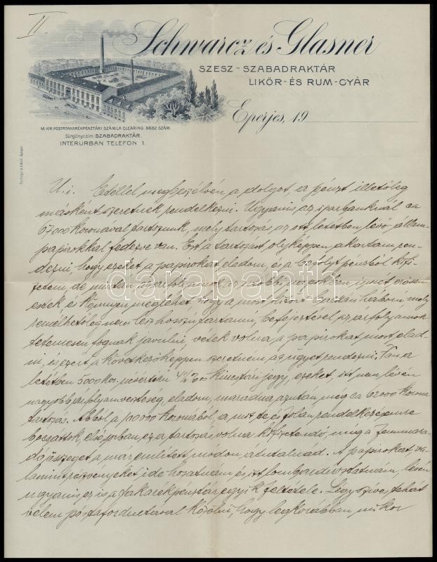 cca 1910 A Schwarz és Glasner Szesz-Szabadraktár Likőr- és Rum-Gyár dekoratív fejléces levélpapírjára írt, a cég ügyeivel foglalkozó levél Glasner Móric tulajdonostól