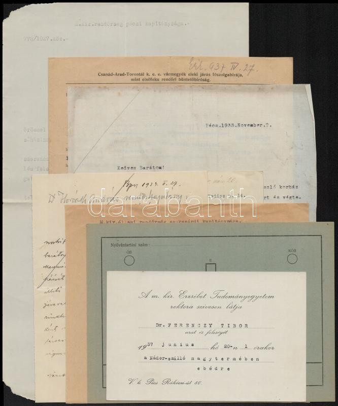 Beschreibung: cca 1927-1937 7 db különféle, rendőrséggel kapcsolatos irat: levél, meghívó, stb.