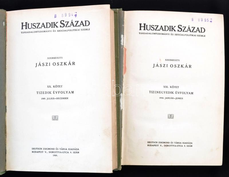 1909-1910 Huszadik Század. Társadalomtudományi és szociálpolitikai szemle. XX. kötet., X. évf. 1909. július-december, XXI. kötet., XI. évf. 1910. január-június. Szerk.: Jászi Oszkár. Bp.,1909-1910, Deutsch Zsigmond és Társa. Egészvászon-kötés, az egyik kötet gerince sérült.