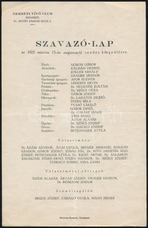 1926 A Nemzeti Vívó club szavazólapja az 1926. évi rendes közgyűlésre, a klub tisztségviselőinek névsorával, pl. Petschauer Attila későbbi olimpiai bajnok