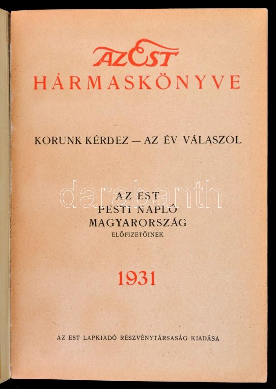1931 Az Est hármas könyve 1931. Bp, Est Lapkiadó. Kiadói papírkötésben... https://www.darabanth.com/de/329-Fernauktion/329.0/Andere-Sammelgebiete/Drucksachen~500029/1931-Az-Est-harmas-konyve-1931-Bp-Est-Lapkiado-Kiadoi-papirkotesben-a-gerincen-kis-seru~II1791610