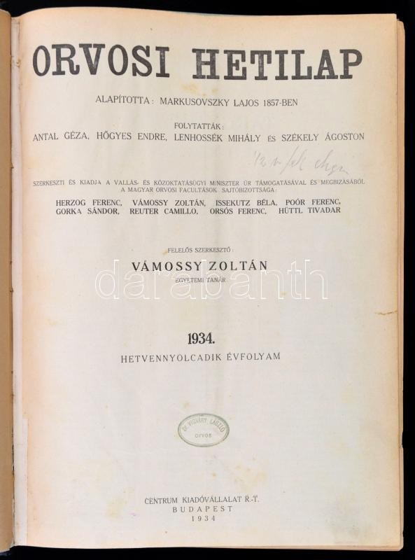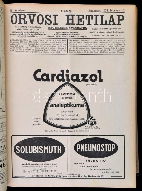 1934 Orvosi hetilap, 1934. 78. évf. 1-52. szám. Szerk.: Vámossy Zoltán. Bp.,1934, Centrum,VIII+2+1214+2 p. Kopottas félvászon-kötésben, rengeteg korabeli reklámmal.