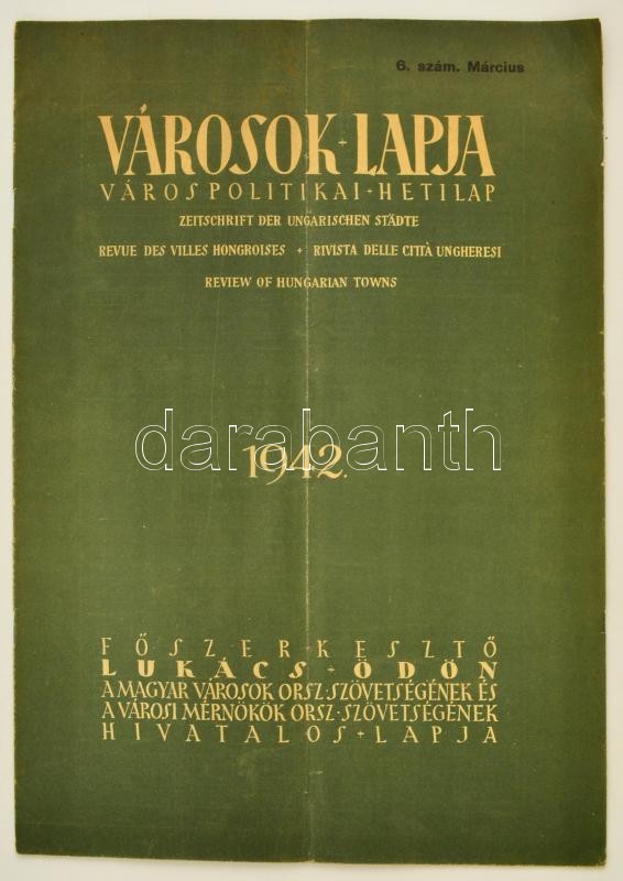 1942 Városok Lapja. Város politikai hetilap. Szerk.: Lukács Ödön. A Magyar Városok Orsz. Szövetségének és a Városi Mérnökök Orsz. Szövetségének hivatalos lapja. XXXVII. évf. 6 szám. 1942. március 16. Papírkötés, középen hajtásnyommal.