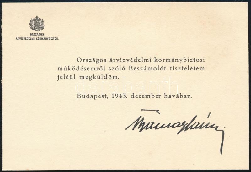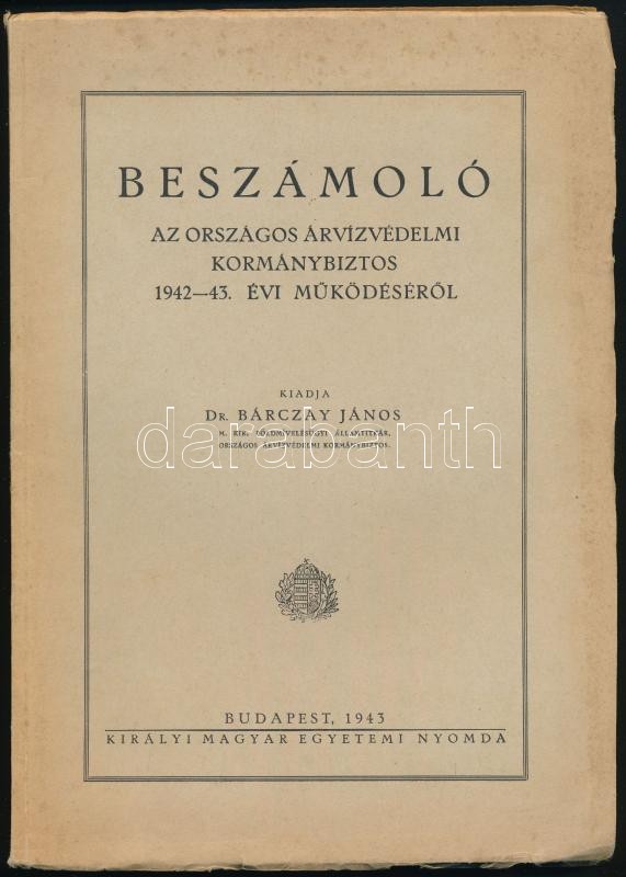 1943 Dr. Bárczay János: Beszámoló az országos árvízvédelmi kormánybiztos 1942-43. évi működéséről. Bp.,1943, Kir. M. Egyetemi Nyomda. Kiadói papírkötés.+A beszámoló megküldésekor mellékelt üdvözlő kártya, Bárczay János aláírásával.