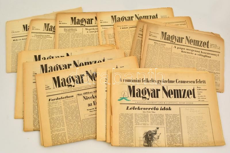 1948-1989 Magyar Nemzet 15 száma, benne a kor híreivel, közte a 1989-es romániai felkelés és Ceausescu bukásának, az éleződő Iraki-Kuvaiti ellentét híreivel, változó állapotban.