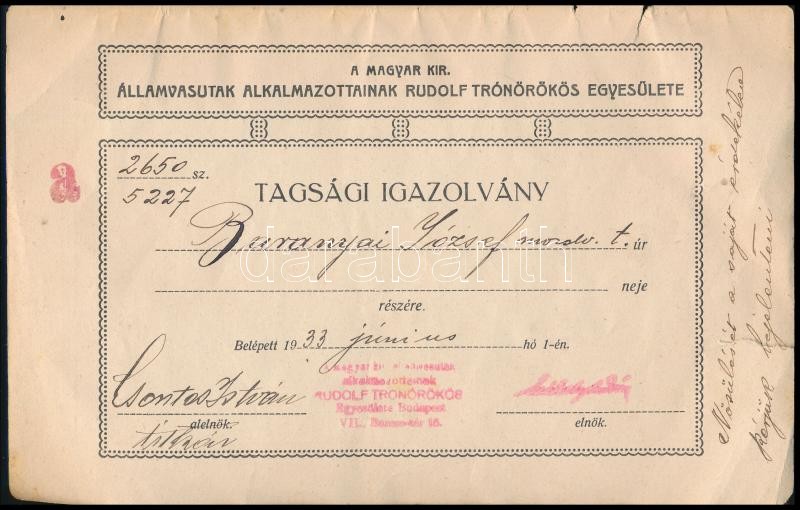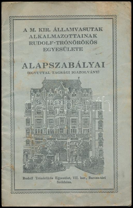 A M. Kir. Államvasutak Alkalmazottainak Rudolf-Trónörökös Egyesülete alapszabályai (egyúttal tagsági igazolvány.) Bp., (1930), Rudolf Trónörökös Egyesület, (Reich Á.-ny.),30+1 p. Kiadói papírkötés, az igazolvány mozdonyvezető részére szól.