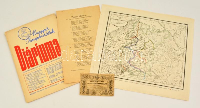 Beschreibung: Vegyes nyomtatvány tétel: parfümcímke, térképlap, Diárium