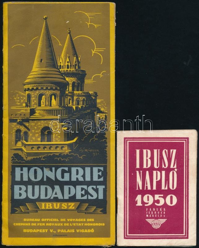 Beschreibung: cca 1930-1950 IBUSZ Hongrie Budapest, francia nyelvű prospektusa. Bp., Athenaeum, 16 p. Kiadói illusztrált papírkötésben, ifj. Richter Aladár (1898-1950) grafikusművész borítójával. +IBUSZ Napló 1950. Január-Március. Bp., Hírlapnyomda, 32 p. Kiadói papírkötés, ceruzás bejegyzésekkel.