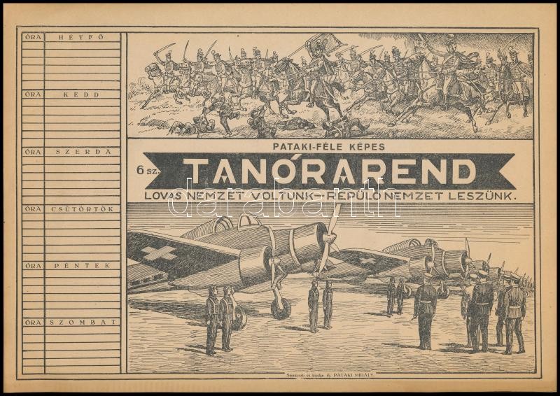 Beschreibung: cca 1930 "Lovas nemzet voltunk, repülős nemzet leszünk", használatlan Pataki-féle tanórarend, 30x20 cm