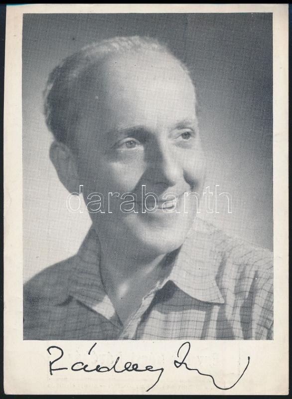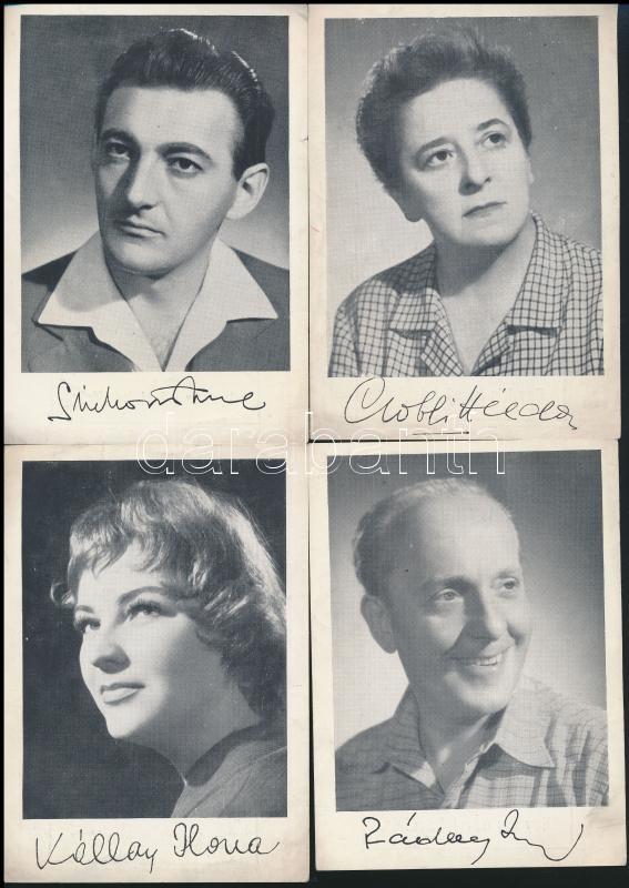 cca 1960 5 db színészeket ábrázoló nyomtatvány, hátoldalán József Attila Színház műsorral, nyomtatott aláírásokkal, Sinkovits Imre, Gobbi Hilda, Kállay Ilona, Ráday Imre
