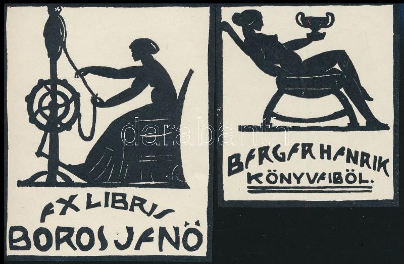 Gergely Sándor (1888-1932): 2 db ex libris (Berger Henrik könyveiből, erotikus ex libris, Ex libris Boros Jenő.) Klisék, papír, jelzések nélkül, körbevágott, 6x5 cm és 8x6 cm.