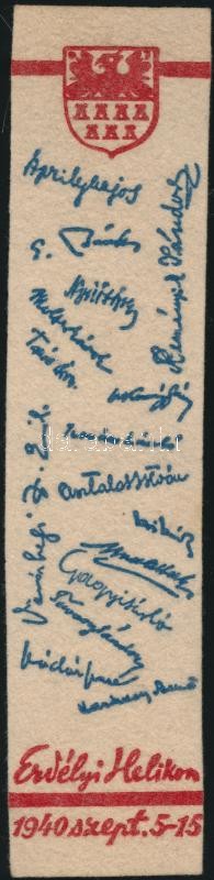 Beschreibung: 1940 szept. 5-15. Erdélyi Helikon szövet könyvjelző, híres írók nyomott aláírásaival.